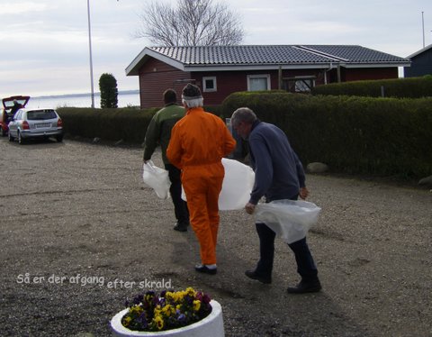 Starten gik fra Vraldhal kl. 09 og alle fik sække og med handsker, river og kæppe gik folk bare i krig for at fylde sækkene med skrald. Kl. 10 var alle tilbage og kunne nyde et par timer med kaffe og rundstykker og en lille én til at varme sig på. Vejret var blæsende fra nordøst (koldt) men lidt sol hjalp lidt på humøret.