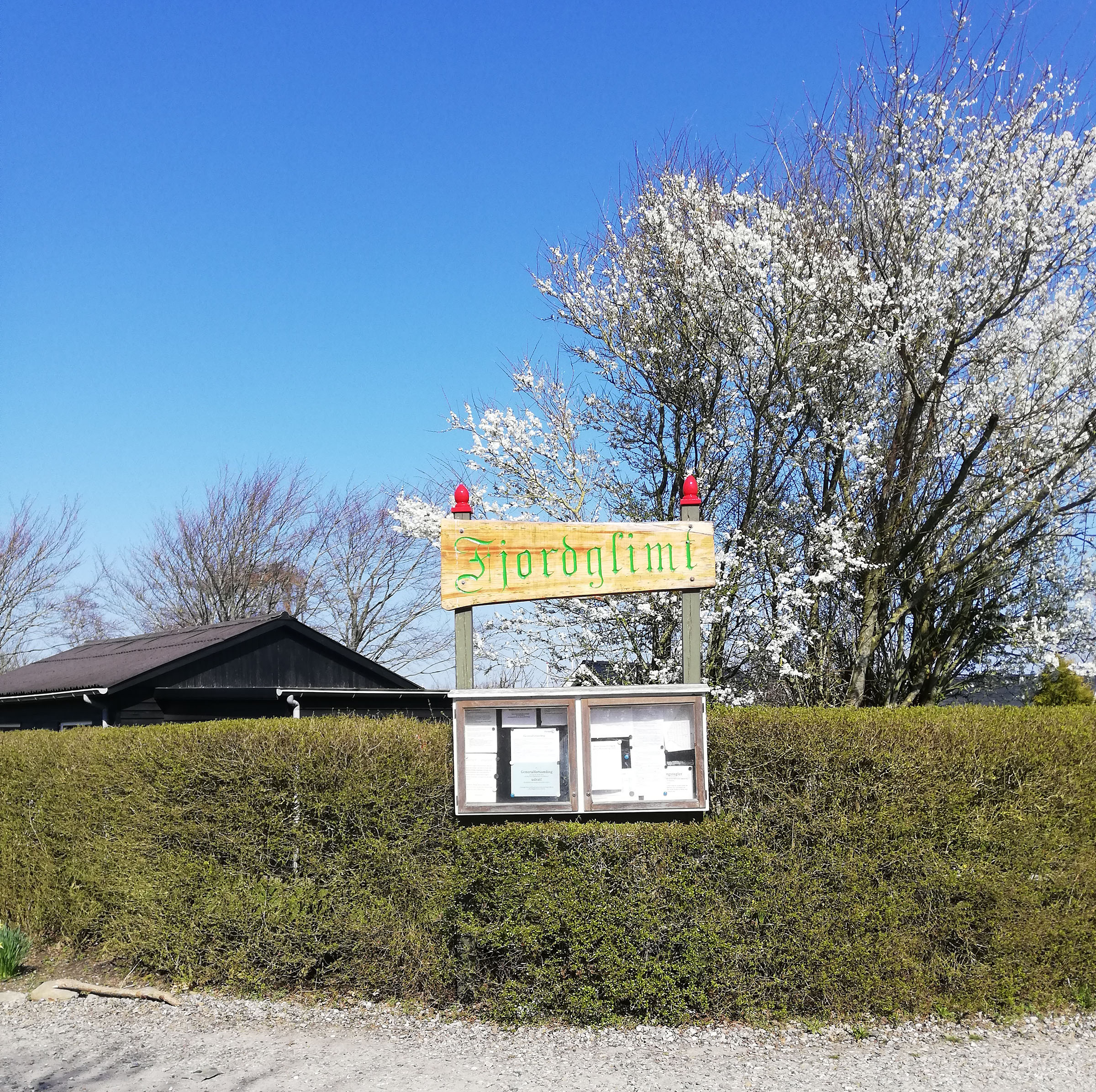 Så er det vist blevet forår. Bemærk de fine røde "løg" på toppen af stolperne. Lydia har malet dem. Det viser sig at det er Jean Hansen, som senest havde have 156, der har lavet dem. Selve skiltet siges det, at Graversen, som havde have 38, har lavet, men i mange år var det Jean der pudsede og lakerede det.